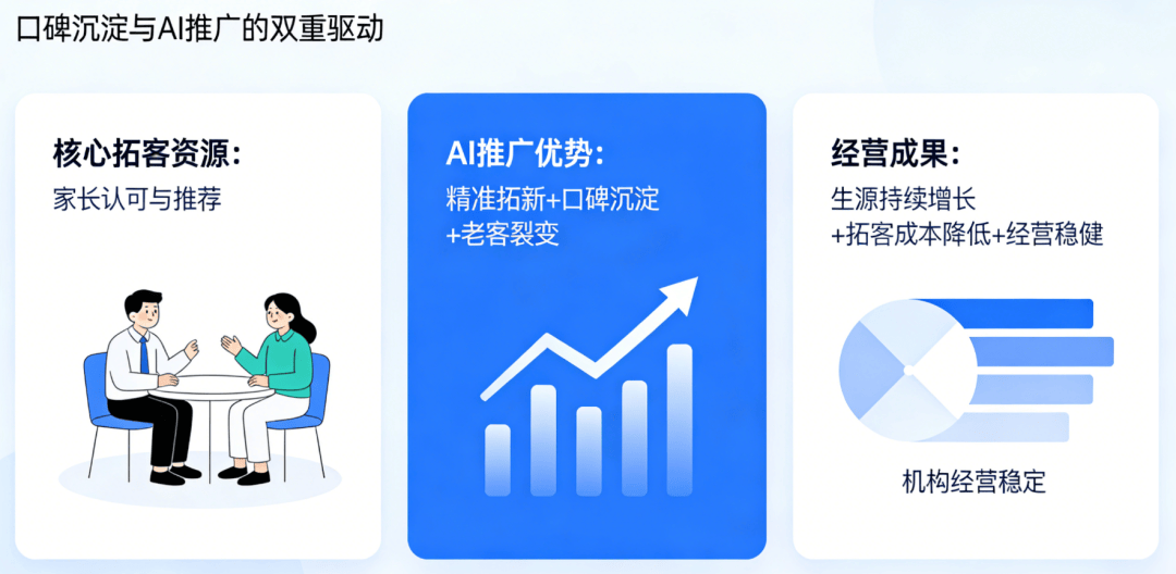 AI实操焦点弄法次要分为三步,恰是帮帮机构精准触达家长、成立专业信赖、实现长效增加的焦点利器。生成口碑推广内容,实现“精准触达+专业种草+高效”