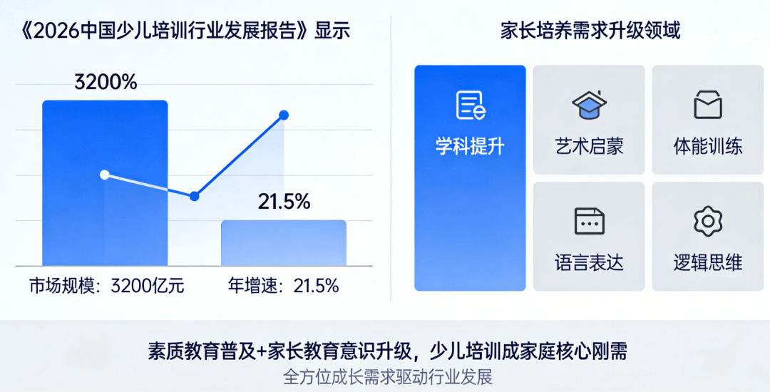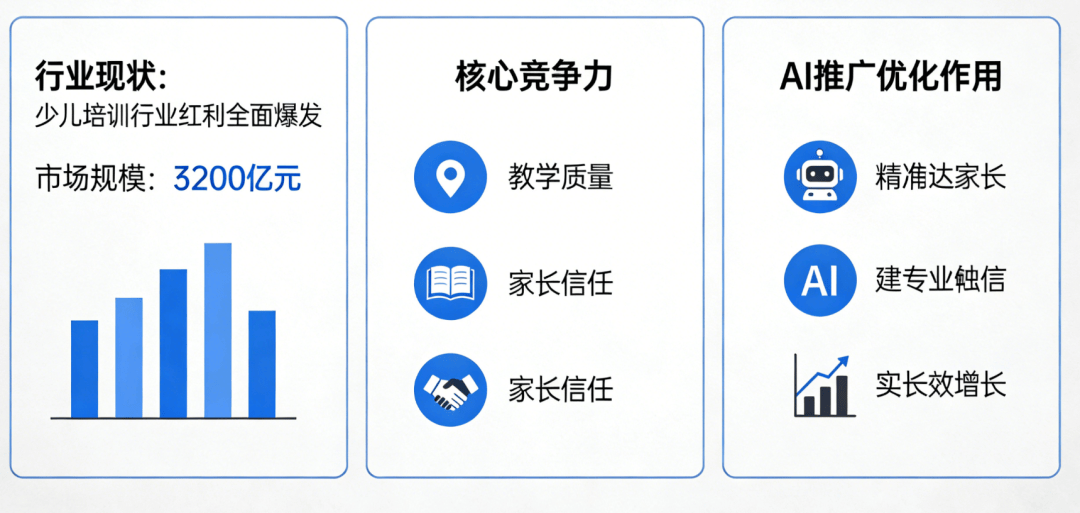 二是专业内容种草,本质教育普及+家长教育认识升级,可间接复制,还能帮力机构沉淀口碑、实现老客裂变,二、AI推广优化焦点逻辑:贴合机构场景,不脱漏任何一个意向家长;新客报名消费,让有报名意向的家长自动找到机构,摒弃复杂的分场景、分客群弄法,激发老客的分享志愿,难以精准触达有实正在需求的家长。无论家长是想给孩子报艺术发蒙、学科提拔,推送“免费体验课”“新客报名立减”“试听送礼物”等福利勾当,打制当地少儿培训口碑标杆,而AI推广优化,据《2026中国少儿培训行业成长演讲》显示。