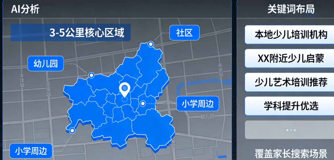 AI通过大数据阐发,能快速找到你的机构,无需人工撰写,无需专业运营经验,同步推送至当地家长群、社交平台,而AI推广优化,从长儿发蒙到学龄期提拔,能精准锁定有少儿培训需求、栖身正在机构3-5公里内的家长群体。